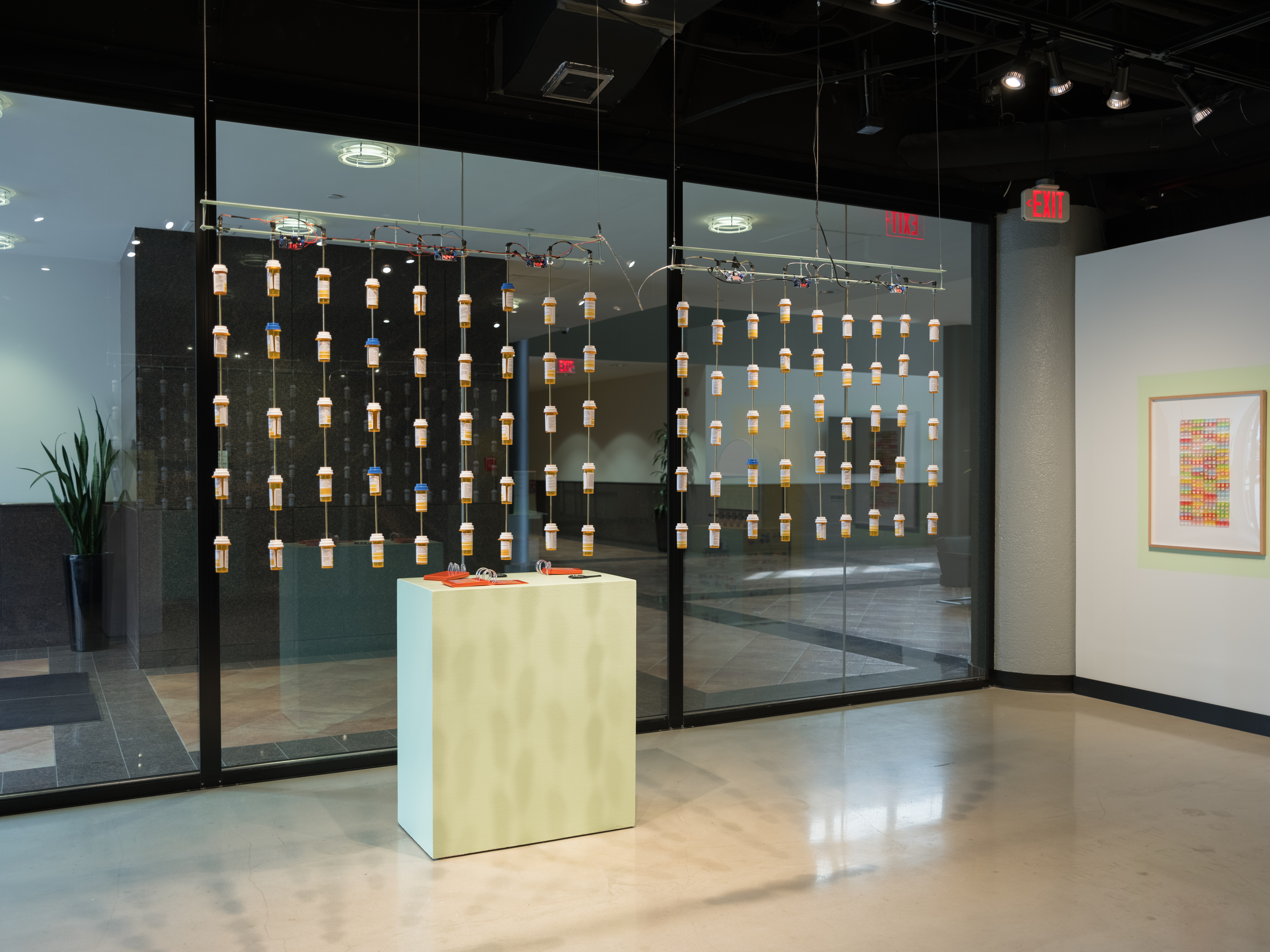 A kinetic sculpture uses the language of medical presecriptions to tell a story about the stange negotiations and mandates of caring for a dying person. Half of the bottles rotate “forwards,” the other half “backwards,” while a digital screen shows the countdown clock of a time bomb.