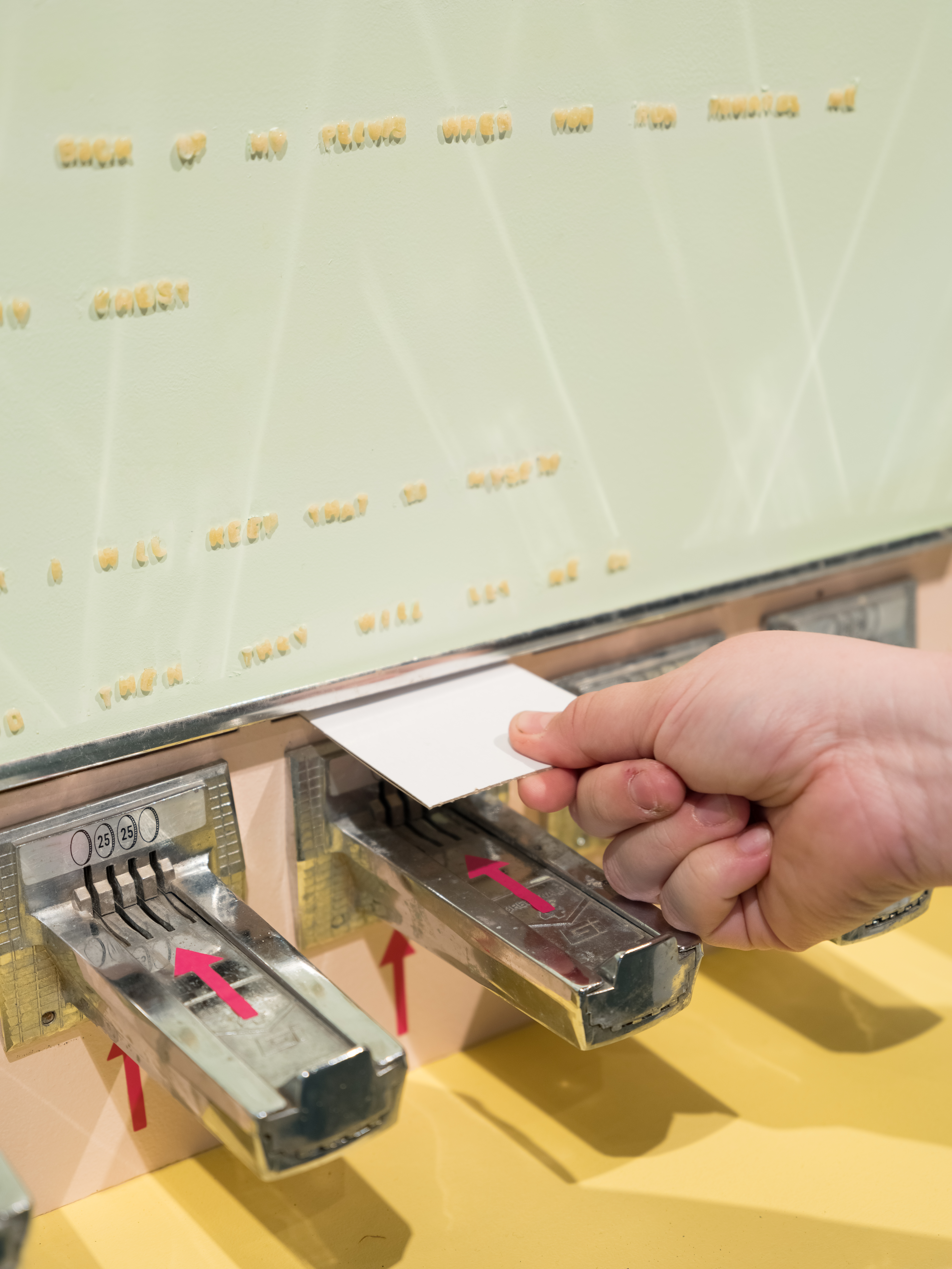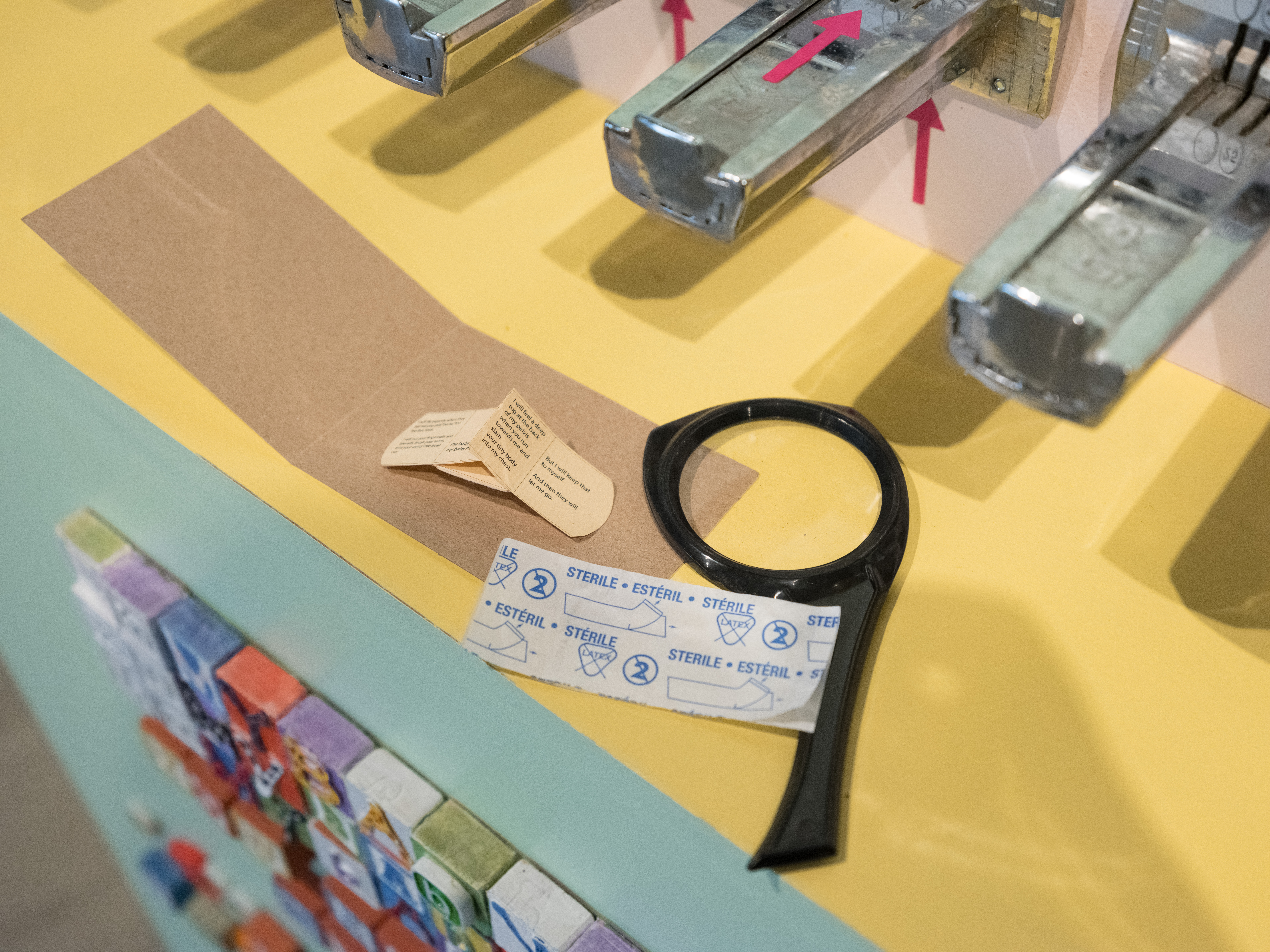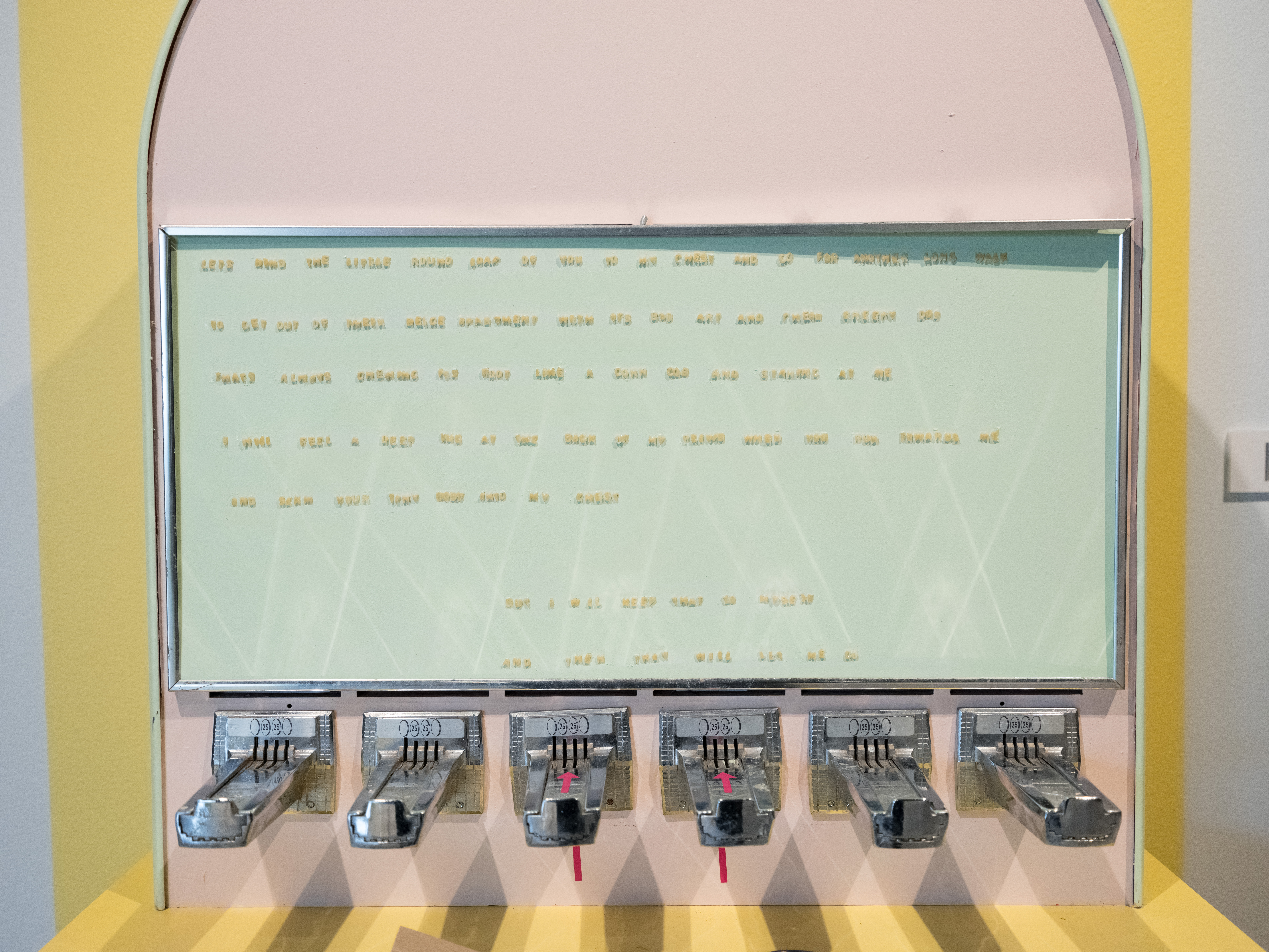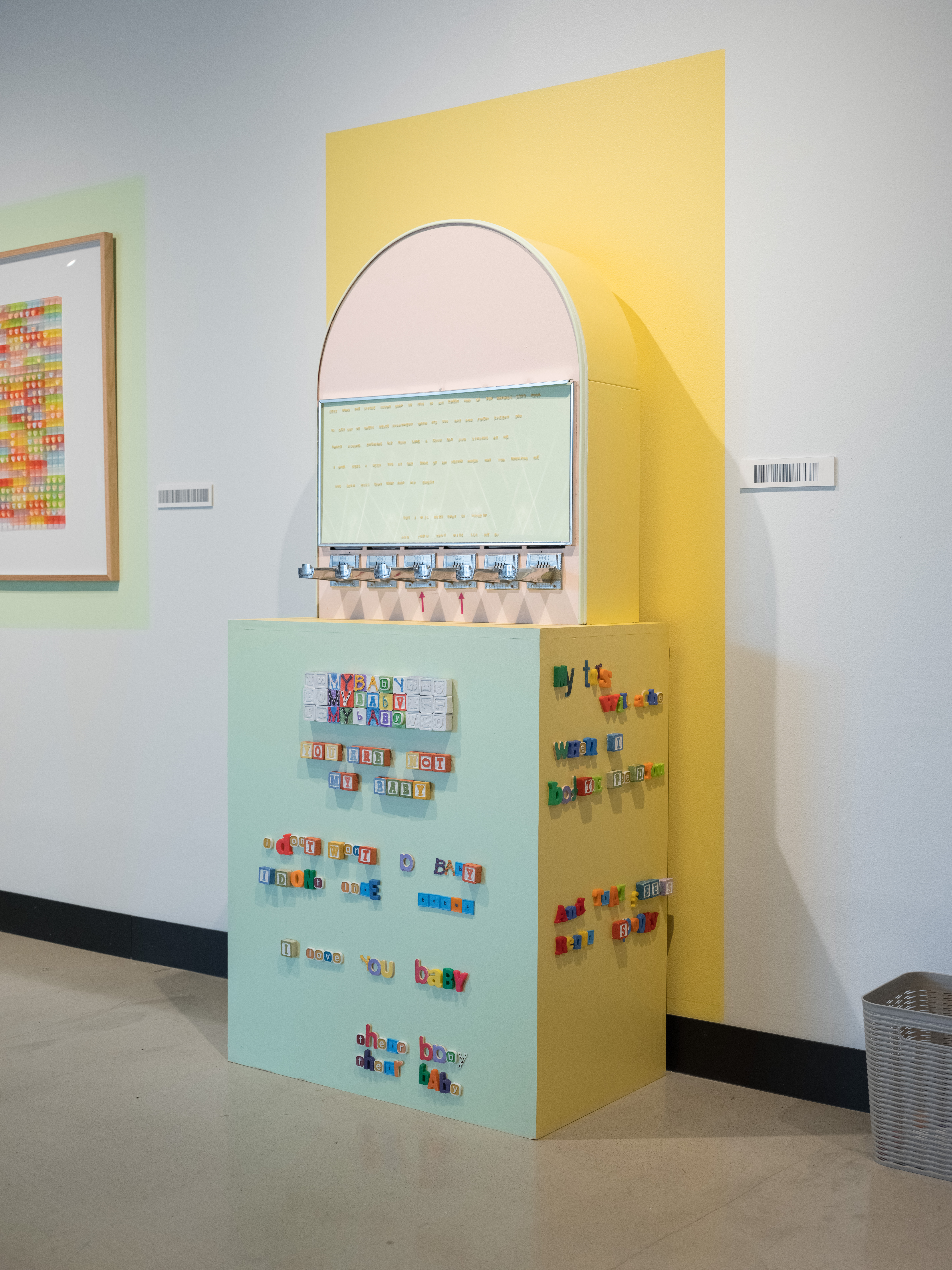 Refurbished vending machine, alphabet pasta, found refrigerator magnets, band-aids